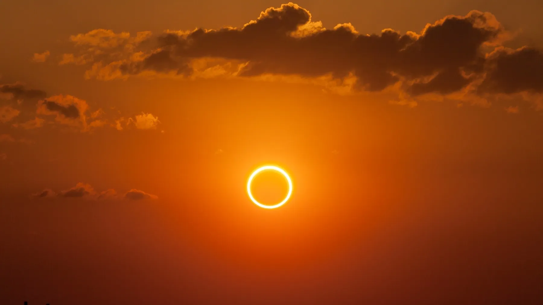 Это явление, известное как кольцевое солнечное затмение, происходит, когда Луна находится вблизи своей самой дальней точки от Земли. Так как она кажется немного меньше на небе, она не полностью закроет солнечный диск. Вместо этого Солнце будет выглядеть как яркое гало, окружающее темный силуэт Луны, отсюда и название "огненное кольцо".