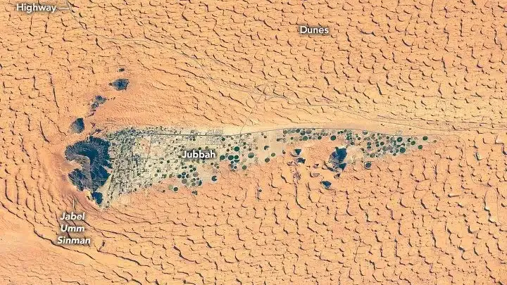 Окруженный высокими дюнами и палящей жарой, этот отдаленный поселок выделяется на спутниковых снимках как лоскутное одеяло из ярких зеленых кругов, свидетельствующее об удивительной сельскохозяйственной жизни, питаемой скрытыми грунтовыми водами.