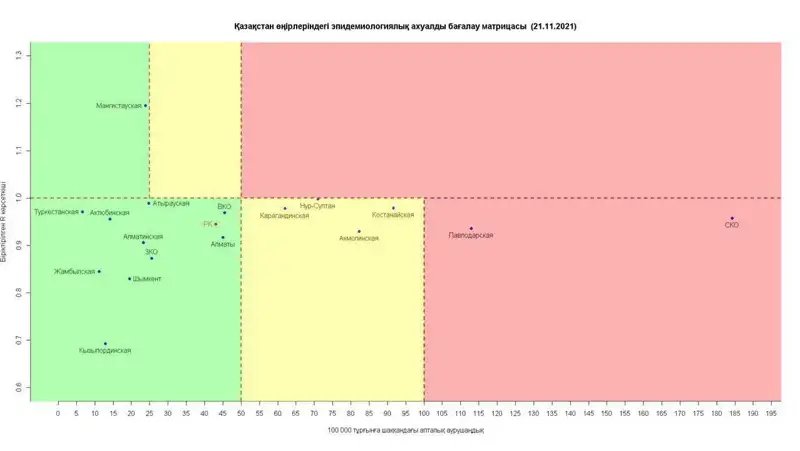 Матрица оценки эпидемиологической ситуации в регионах Казахстана на 21 ноября 2021 года: