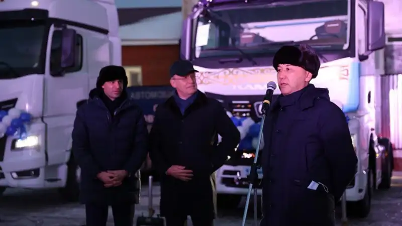 Далее гости на территории Костанайского автоцентра «КАМАЗ» поучаствовали в церемонии передачи первых грузовых автомобилей от ПАО «КАМАЗ» костанайской транспортной компании «AUTOCARGO KZ».