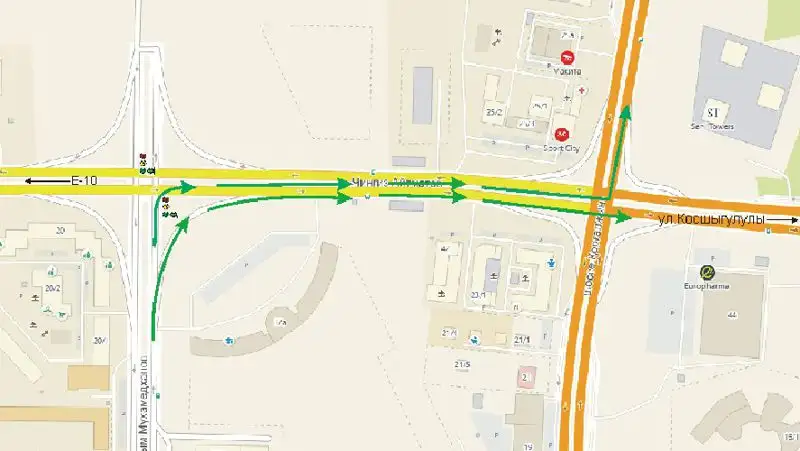 В работу светофорного объекта установлена дополнительная секция для правого поворота на улицу Айтматова со стороны Омарова. При этом для транспорта, планирующего движение на перекрестке Коргалжинского шоссе с улицы Бейсекова в прямом направлении в сторону Сейфуллина, рекомендуется проезд по обустроенному правому съезду с Мухамедханова на Айтматова. Для транспорта, планирующего движение на перекрестке Коргалжинского шоссе с улицы Бейсекова с левым поворотом в сторону Ильинки, правый поворот осуществлять непосредственно на пересечении Мухамедханова-Айтматова под разрешающую дополнительную секцию светофора.
