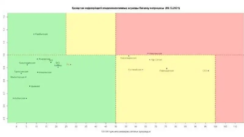 Матрица оценки эпидемиологической ситуации в регионах Казахстана на 9 декабря 2021 года: