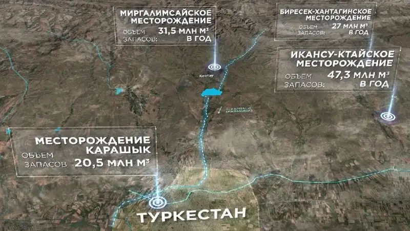 В ходе поиска источников воды для Туркестана было подсчитано, что вода из затопленных шахт Кентау может дать городу порядка 40 млн куб. м. То есть проект одновременно решит проблему подтопления Кентау и даст воду для полива Туркестана.