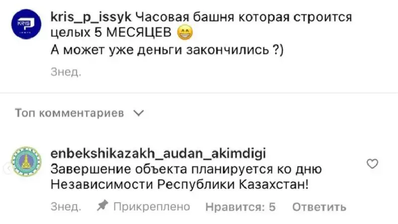 Вместе с фотографией «Биг-Бен по-иссыкски» был опубликован комментарий акимата Енбекшиказахского района, в котором говорилось, что завершение строительства часовой башни планируется ко Дню Независимости РК.