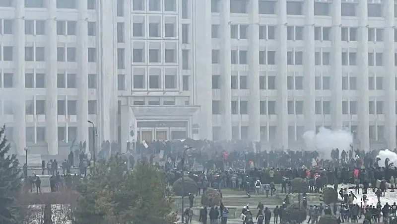 Митингующие, вооруженные арматурами, палками и щитами, штурмуют здание акимата Алматы на площади Республики.