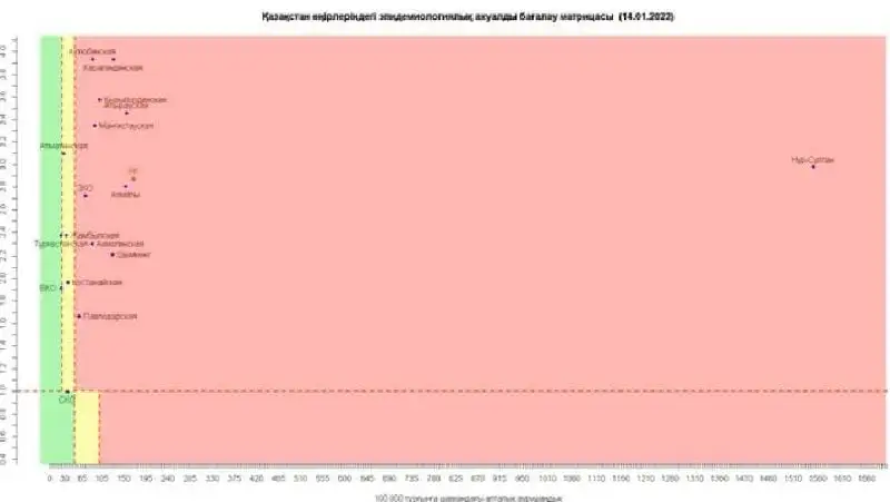 Матрицу оценки эпидемиологической ситуации в регионах Казахстана на 13 января предоставили в МВК по нераспространению COVID-19, сообщает Zakon.kz.