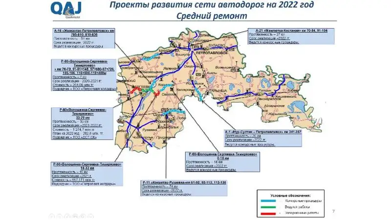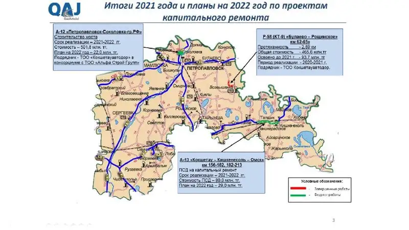 В этом году продолжается ремонт дорог на участках: Казгородок – Горьковское, Еленовка – Арыкбалык – Чистополье – Есиль, Виноградовка – Ясная поляна – Кирово, Краснокиевка – Октябрьское, Петровка – Жанажол – Баумана. Завершим реконструкцию 70 км дорожного полотна Тайынша – Чкалово. По итогу новая транспортная артерия соединит два района и областной центр.Кумар Аксакалов