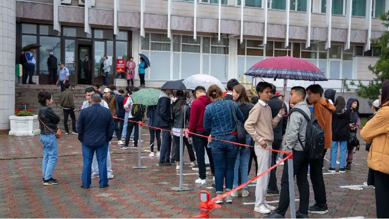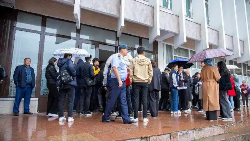 Школьники прибыли к месту сдачи экзамена, на входе наблюдается очередь. Все аудитории подготовлены к ЕНТ.