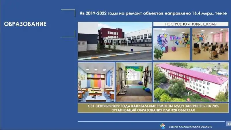 В этом году обновится материально-техническая база 83 школ. Приобретают 28 предметных кабинетов для школ и 29 школьных автобусов. В данное время капитальный ремонт идет в 27 школах на 2,4 млрд тенге.