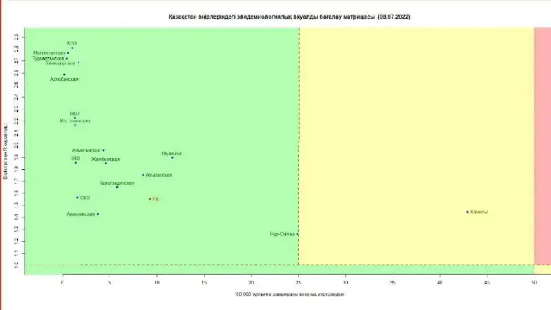 В «желтой» зоне по-прежнему находится город Алматы. Нур-Султан приближается к «желтой» зоне.