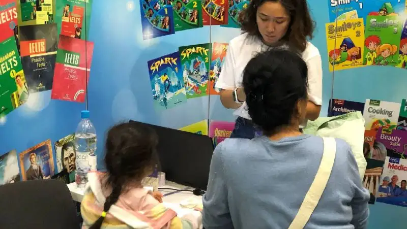 По соседству представлена площадка центра обучения «Академии гениев». По словам менеджера Людмилы Тен, компания специализируется на интеллектуальных занятиях.