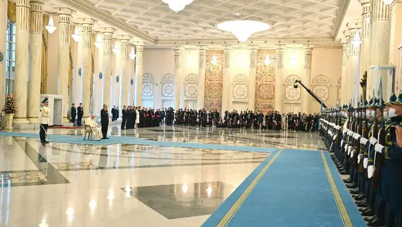Переговорам предшествовала официальная церемония встречи Понтифика во дворце президента. После того как начальник роты почетного караула отдал приветственный рапорт, прозвучали государственные гимны двух стран. Касым-Жомарт Токаев и Папа Римский совершили обход почетного караула. Затем в Восточном зале состоялись двусторонние переговоры, передает Акорда.