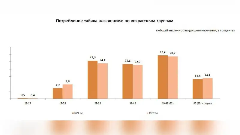 В 2022 году по сравнению с 2021 годом доля курящих респондентов увеличилась в возрастных группах 18-28 лет и 60 (63) лет и старше, в остальных возрастных группах – снизилась.Пресс-служба Бюро национальной статистики