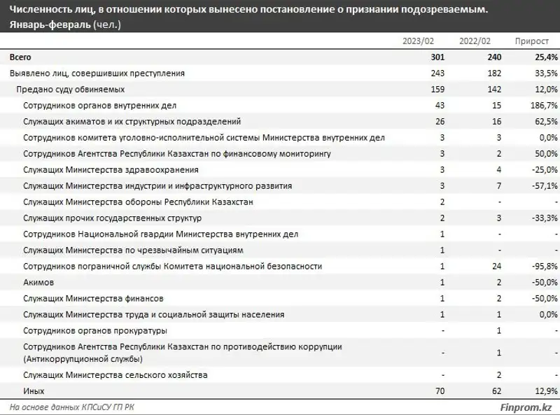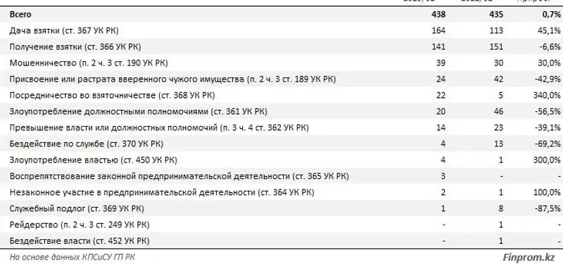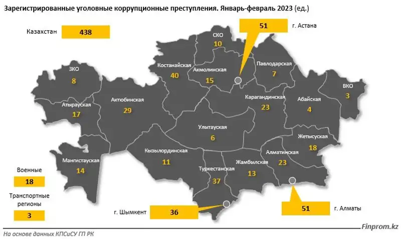 По информации Finprom.kz, за январь-февраль 2023 года в стране зарегистрировали 438 уголовных коррупционных преступлений — на 0,7% больше, чем годом ранее (в аналогичном периоде прошлого года было зарегистрировано 435 таких преступлений, с годовым ростом на 8,5%).