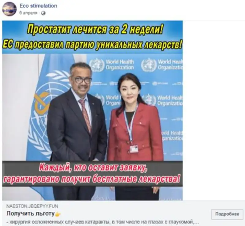 В Facebook можно встретить сообщение, согласно которому Европейский союз поставил в Казахстан партию уникальных лекарств, способных вылечить простатит всего за два дня. Получить этот чудо-препарат можно бесплатно, оставив заявку и указав номер телефона.