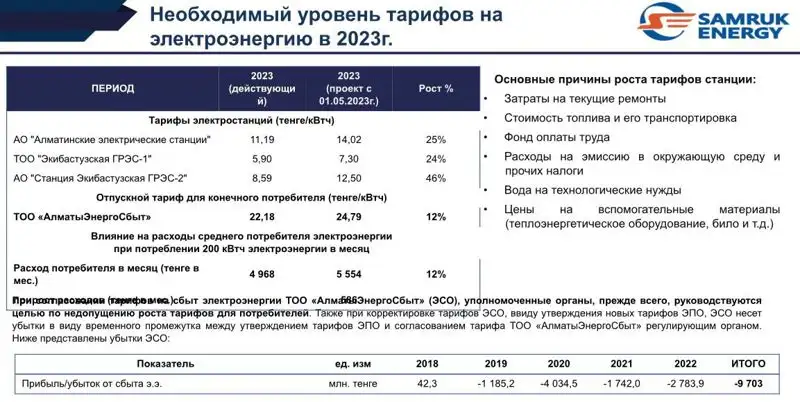 Во время заседания общественного совета фонда "Самрук-Қазына" он объяснил, что для обеспечения надежного функционирования электрических станций рост тарифов на электроэнергию необходим и прогнозируется: