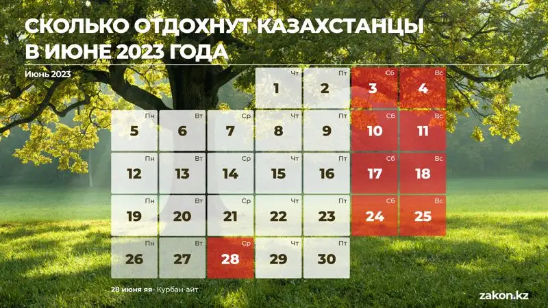 В июне 2023 года казахстанцы, помимо обычных выходных, дополнительно получат еще один выходной день, сообщает Zakon.kz.