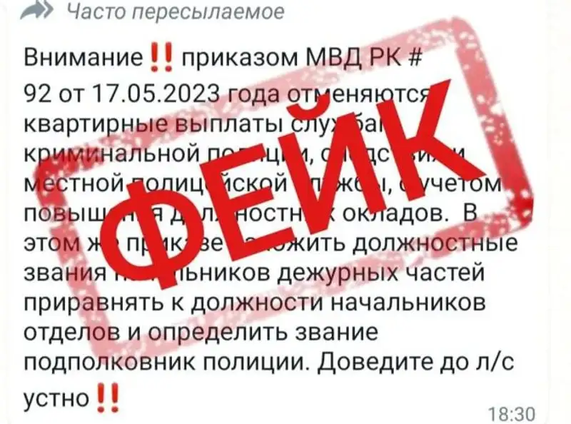 Через WhatsApp казахстанцы распространяют сообщение о том, что сотрудникам криминальной полиции, следствия и местной полицейской службы перестанут платить жилищные выплаты, сообщает Zakon.kz.
