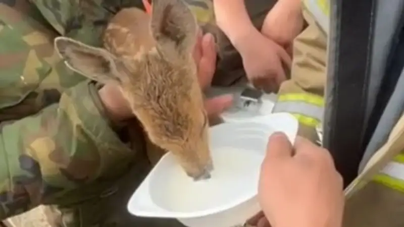 На видео видно, как пожарные промыли животному глаза, покормили молоком и передали инспектору лесного хозяйства.