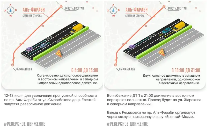 - с 06:00 будет организован отвод транспортных средств путем реверсного движения с северной стороны пр. аль-Фараби – от ул. Сыргабекова до р. Есентай;