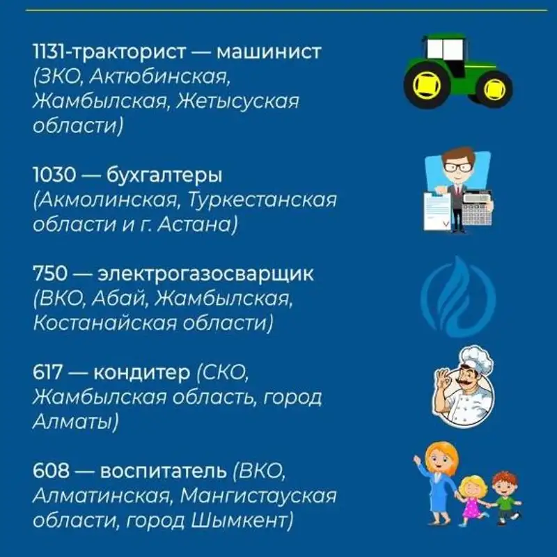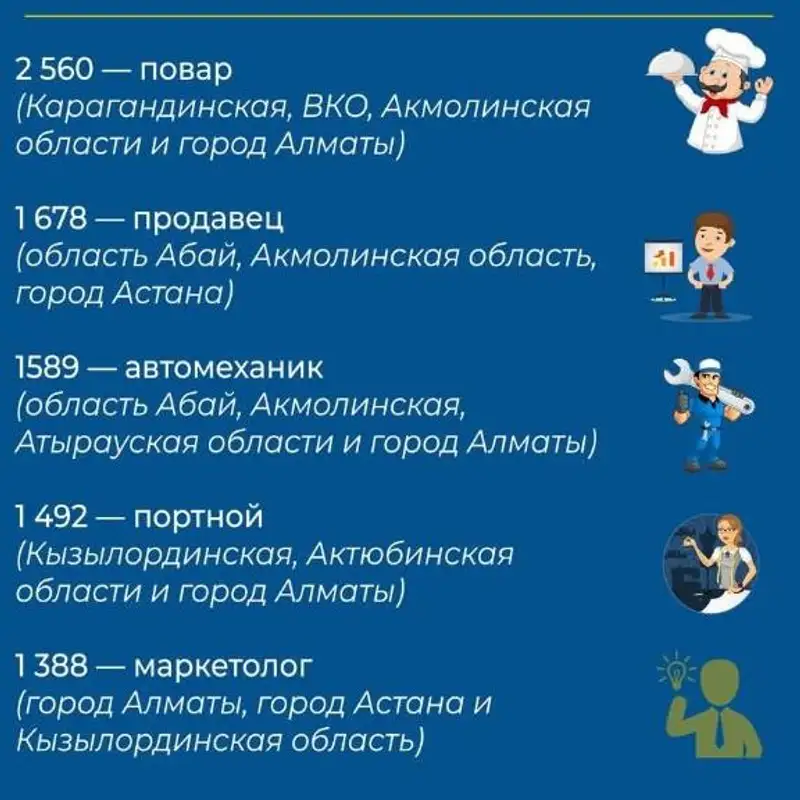 Повара наиболее востребованы в Карагандинской области, ВКО, Акмолинской области и Алматы. Продавцы нужнее всего в Абайской и Акмолинской областях, а также в Астане. Автомеханики требуются в Абайской, Акмолинской, Атырауской областях и Алматы.