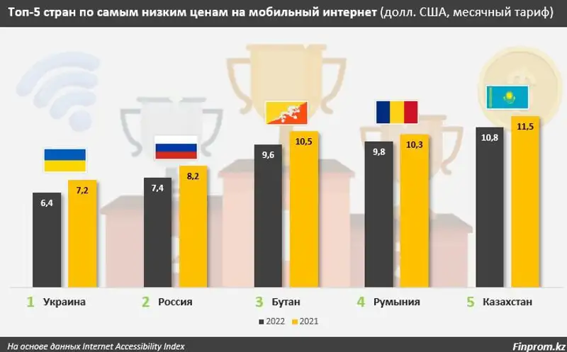 Цена мобильного интернета в Казахстане на самом деле является одной из самых низких в мире. Так, согласно данным Internet Accessibility Index, республика заняла 5-е место среди 164 стран мира по низкой стоимости мобильного интернета. По итогам 2022 года, мобильный интернет обходился казахстанцам в среднем в 10,8 доллара в месяц.