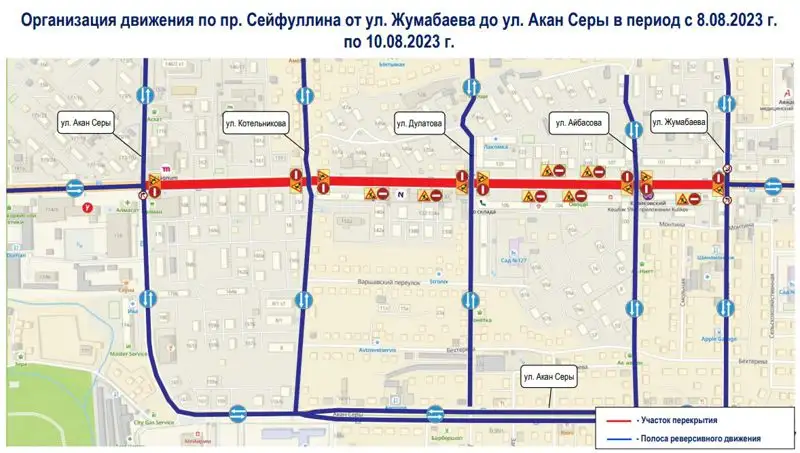 Также отмечено, что сквозное движение транспорта по ул. Жумабаева, ул. Айбасова, ул. Дулатова, ул. Котельникова, ул. Акан Серы будет доступно.
