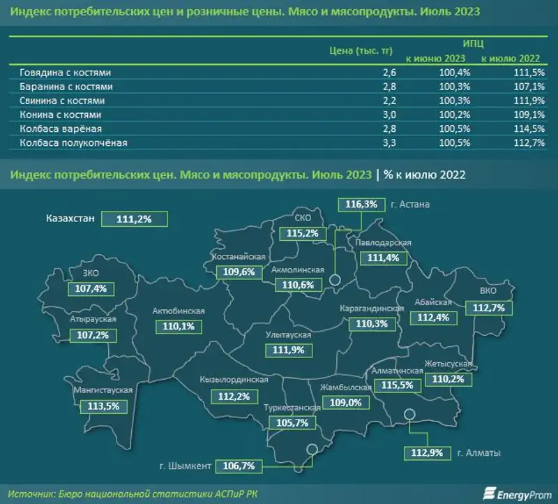 По итогам июля 2023 года цены на мясо, включая мясопродукты, выросли на 0,3% за месяц и на 11,2% за год.