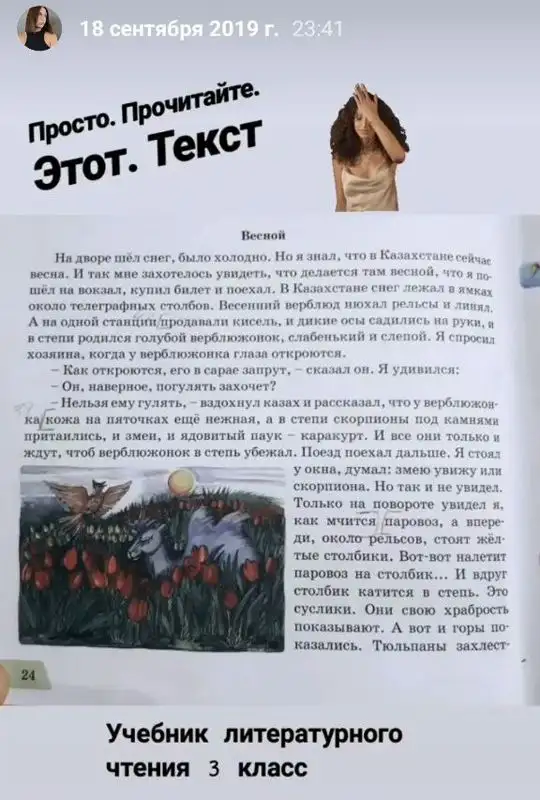 С начала прошлой недели в социальных сетях казахстанцы делятся роликами, в которых выражают свои возмущения содержанием учебника "Литературное чтение" за третий класс. На одном из видео родительница открывает книгу и начинает читать рассказ под названием "Весной".