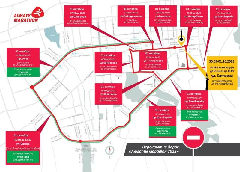 С 6:00 30 сентября до 18:00 1 октября по ул. Сатпаева от ул. Желтоксан до пр. Назарбаева будут перекрыты обе полосы движения. Это связано с тем, что старт и финиш марафона будут находиться на площади Республики.