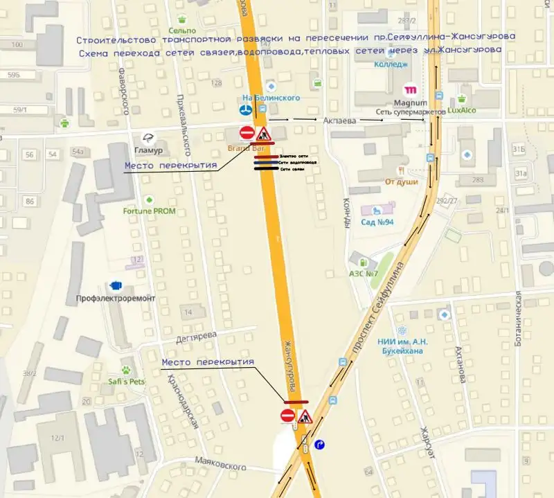 Объезд закрытого участка будет осуществлен через ул. Акпаева, пр. Сейфуллина и прилегающим улицам.
