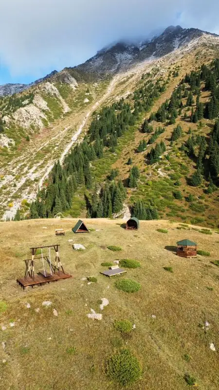 Кемпинг-зона представляет собой оборудованную площадку для любителей горного отдыха, трекинга, хайкинга и продолжительных прогулок с палаткой. Для комфортного и безопасного отдыха туристов отведены палаточные места, установлены уютные беседки, столы со скамейками и качели "Алтыбакан" в национальном стиле.