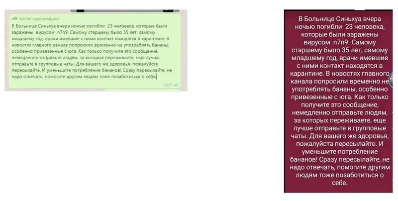 "В больнице Синьхуа вчера ночью погибли 23 человека, которые были заражены вирусом N7N90. Самому старшему было 35 лет, а самому младшему год. Врачи, контактирующие с ними, находятся на карантине. В новостях главного канала попросили временно не употреблять бананы, особенно – привезенные с юга. Как только получите это сообщение, немедленно отправьте его людям, за которых переживаете, еще лучше отправьте в групповые чаты. Для вашего же здоровья, пожалуйста, пересылайте. И уменьшите потребление бананов! Сразу пересылайте, не надо отвечать, помогите другим людям тоже позаботиться о себе", – говорится в рассылке.