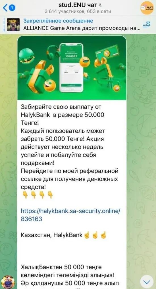"Рассылка от имени Halyk Bank о выплате в размере 50 тысяч тенге – это фейк", – сказано в заключении.