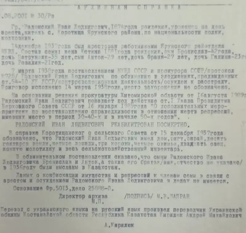 По словам Виктора Леонидовича, во время депортации семью Радомских разделили: прадеда Ивана не включили в список и оставили в Украине. Почти 30 лет семья ничего о нем не знала, и только в 1960 годы стало известно, что его арестовали. Уже в 2001 году на запрос Виктора Радомского из Житомирского архива прислали справку о том, что через три месяца после депортации семьи Иван Людвигович был арестован "за злодеяния перед советской властью". Несколько месяцев он провел в следственном изоляторе, а в 1938 году по решению "тройки" его расстреляли, но место захоронения осталось неизвестным. В справке имеется описание хозяйства прадеда: много скота, сельскохозяйственных построек, инвентаря, 10 гектаров земли. Но на самом деле семья находилась между "нищетой и бедностью", а хозяйство было надуманным. Все это было сделано для того, чтобы показать борьбу с кулаками и "антисоветскими элементами". В этом же документе указано, что в 1989 году Ивана Радомского посмертно реабилитировали.
