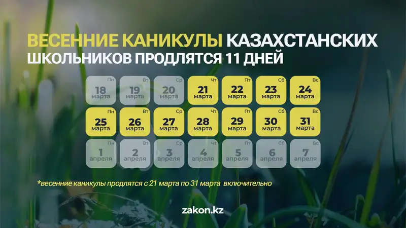 В казахстанских школах завершается третья четверть. Весенние каникулы продлятся 11 дней: с 21 по 31 марта включительно, сообщает Zakon.kz.