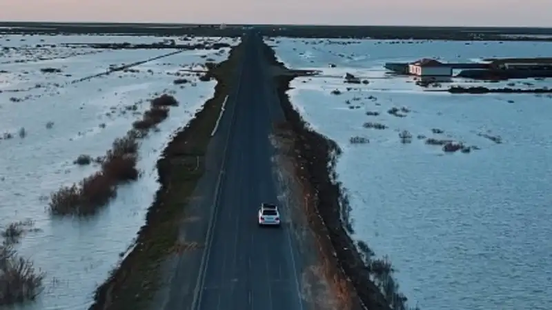 Известный общественник Азамат Сарсенбаев поделился с подписчиками видео затопленного участка из Атырауской области. На кадрах машина едет по трассе, затопленной с двух сторон, сообщает Zakon.kz.