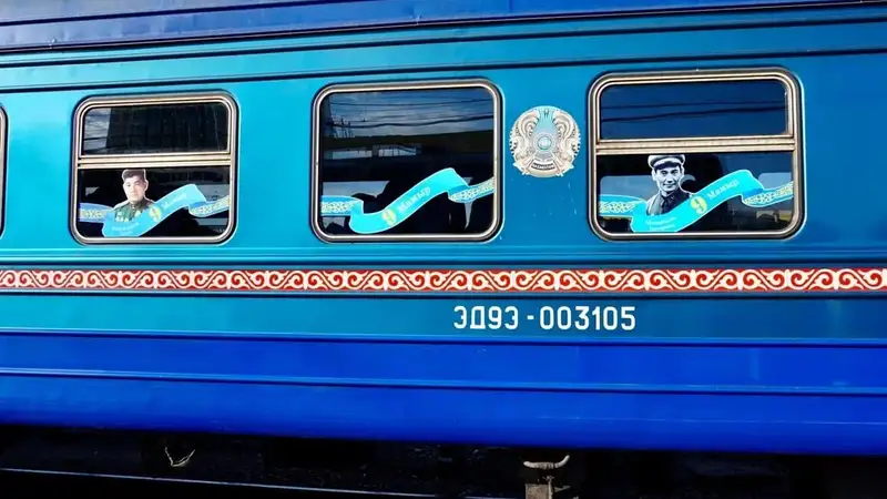 "Состав оформлен изображениями национальной ленты Победы и фотографиями Героев войны Бауыржана Момышулы, Маншук Маметовой, Алии Молдагуловой, Касыма Кайсенова, Талгата Бегельдинова и других, кто самоотверженно защищал Родину. В честь праздника лацканы пиджаков проводников украсила казахстанская лента Победы. Первые пассажиры с удовольствием фотографировались на фоне Поезда Победы", – говорится в сообщении АО.