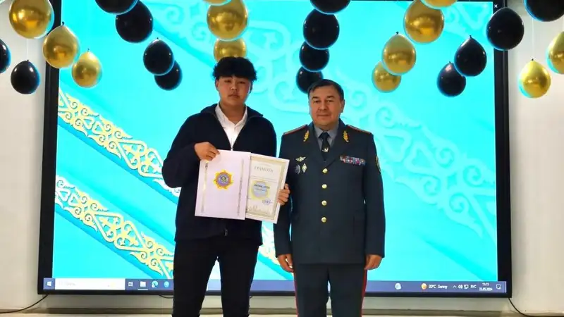 Начальник ДЧС Астаны Марат Кульдиков наградил Акана Акимжанова и его родителей благодарственными письмами министра по ЧС РК и вручил ценные подарки на школьном собрании.