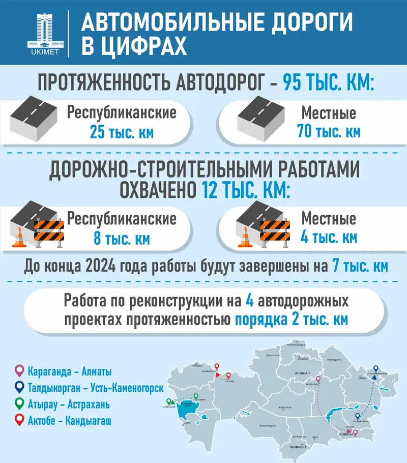 Ведутся работы по реконструкции четырех крупных автодорожных проектов "Караганда – Алматы", "Талдыкорган – Усть-Каменогорск", "Атырау – Астрахань" и "Актобе – Кандыагаш". Некоторые участки этих дорог уже начали вводить в эксплуатацию с середины лета, а завершение всех объектов планируется до конца года.
