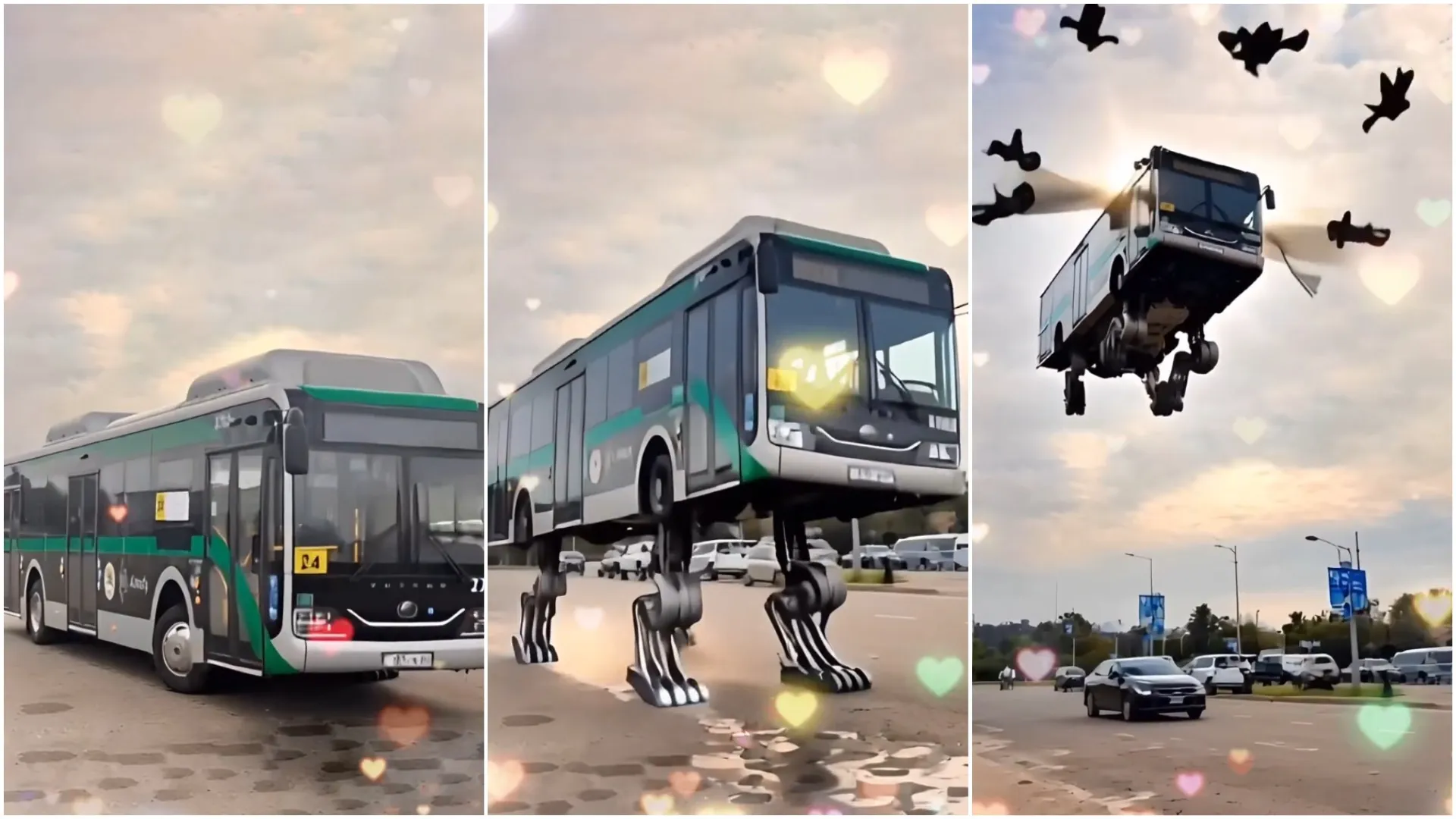 На видео можно увидеть обычный маршрут №24, у которого через некоторое время появляются четыре железные лапы, а затем и крылья, после чего автобус взлетает.