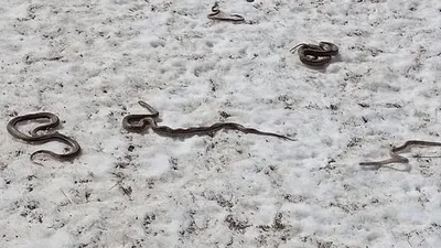 "15 апреля текущего года на поверхности снега было замечено сразу девять змей. Они были очень слабы, не проявляли агрессии, а наоборот – старались уползти на сухую землю. Если вы встретите змею на снегу в лесу или степи, лучше ее не трогать, дайте ей уползти. В это время они особенно уязвимы и не представляют опасности ", – пояснили в Тарбагатайском государственном национальном парке.