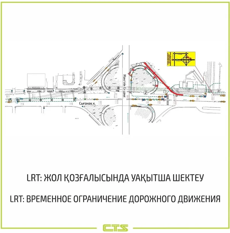 - с 21:00 20 апреля по 25 сентября для строительства надземного пешеходного перехода на станции 113 от Дома министерств полностью ограничат движение по правостороннему съезду с улицы Сыганак на проспект Мангилик Ел (в сторону улицы Достык) для транспорта, движущегося со стороны моста Арыс;
