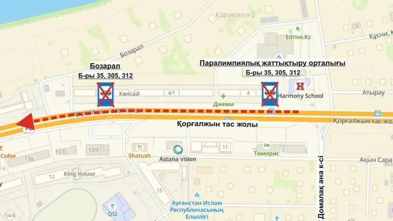 Маршруты № 35, 305, 312 временно не будут высаживать пассажиров на остановочных пунктах "Паралимпиялық жаттықтыру орталығы", "Бозарал".