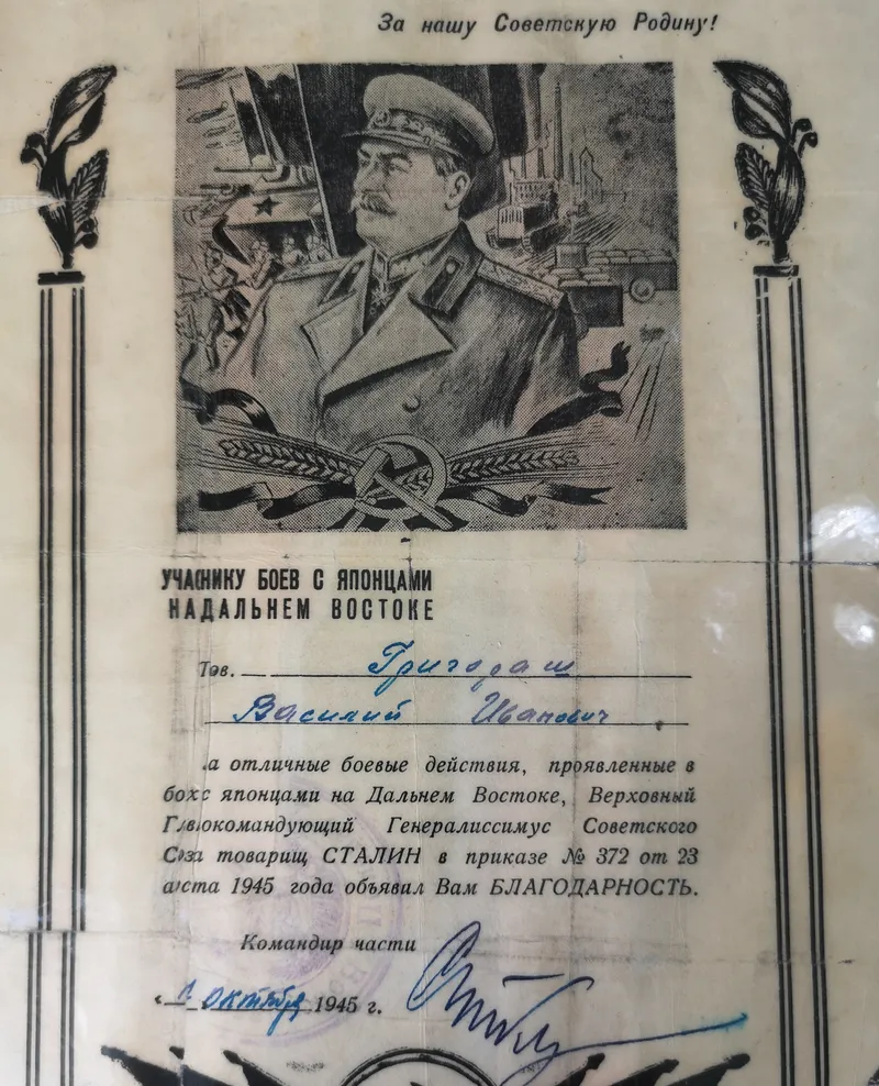 Но до этого момента было еще далеко. Находящиеся на Дальнем Востоке солдаты с жадностью прослушивали сводки о продвижении Красной Армии, гнавшей фашистов все дальше на Запад. Василий Григораш завел карту, на которой отмечал освобожденные города. 9 мая 1945 года им в торжественной обстановке объявили, что фашистская Германия пала.