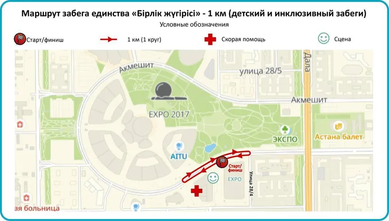 Согласно предоставленной информации, старт забега состоится в районе МВЦ EXPO. На время проведения мероприятия будут закрывать движение на участках улиц Туркестан и Акмешит по следующему графику:
