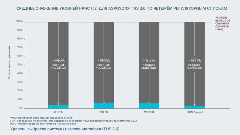 В исследовании ученые использовали хиттеры компании ФМИ "Филип Моррис Интернешнл" THS 3.0 с индукционным нагревом и провели всесторонний анализ состава выделяемого аэрозоля и его токсичности. Ученые сравнили уровни вредных компонентов (HPHC) в аэрозоле и их уровни в табачном дыму. Оказалось, что хиттеры (системы нагревания табака) нового поколения образуют аэрозоль, в котором содержание HPHC на 95-97 % меньше по сравнению с сигаретами. Это было подтверждено протоколами Всемирной организации здравоохранения (ВОЗ), Управления по контролю за продуктами и лекарствами США (FDA) и Международного агентства по изучению рака (IARC) (см. рисунок 1).