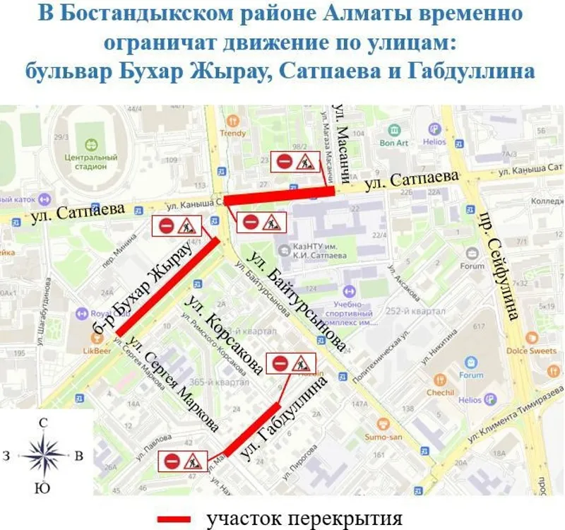 Часть Бухар Жырау, Сатпаева и Габдуллина в Алматы перекроют до конца августа