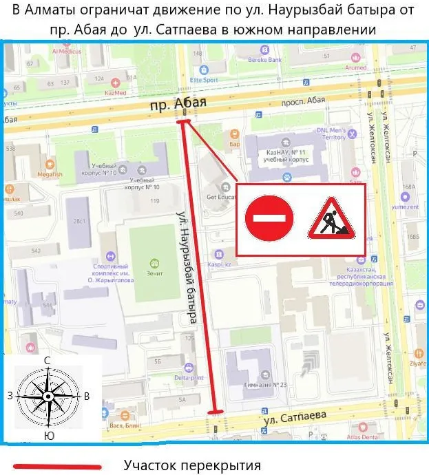 Так, с 23:00 3 июня до 08:00 4 июня движение автотранспорта будет частично ограничено на улице Наурызбай батыра от проспекта Абая до улицы Сатпаева.