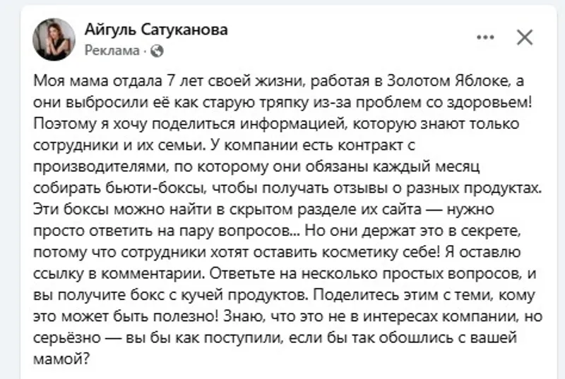Как пишет stopfake.kz, она связана с тем, что граждан просят пройти опрос, после которого они якобы получат бьюти-наборы от известного интернет-магазина косметики и парфюмерии "Золотое яблоко".